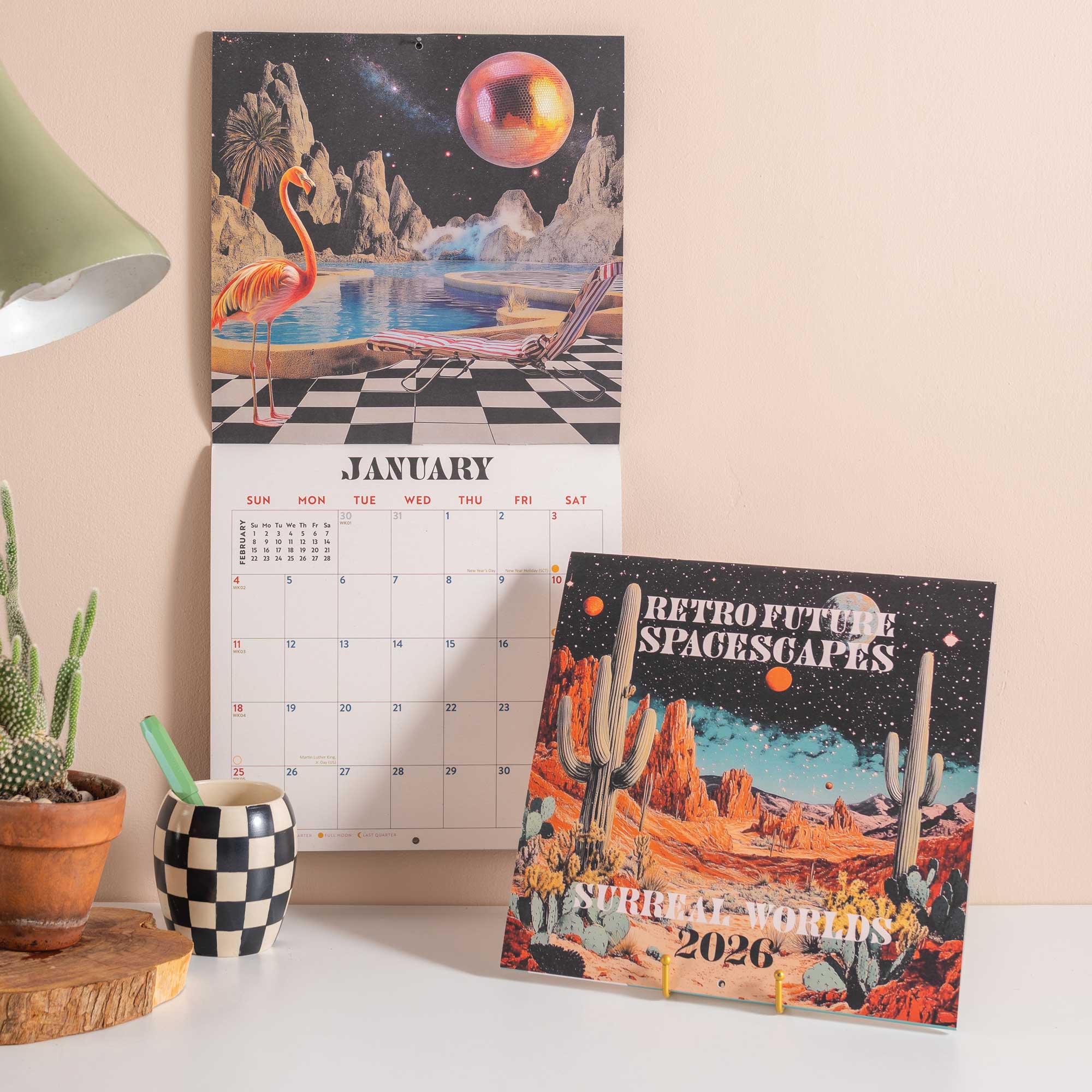 A bold, cosmic clash of eras, this 2026 wall calendar serves up surreal space scenes with a heavy dose of retro-futuristic weirdness.