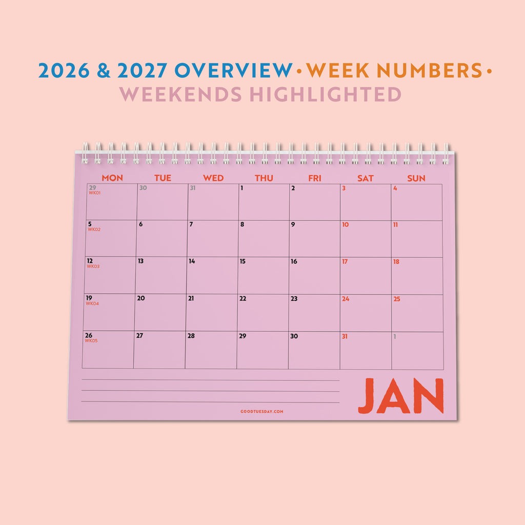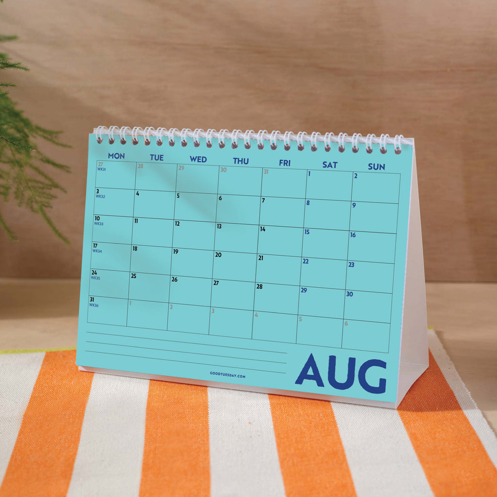 Simple yet bold - this super practical freestanding desk calendar give a clear overview of the month - with space to write deadlines, events and other key dates. Designed to brighten up your desk, without too much fuss.