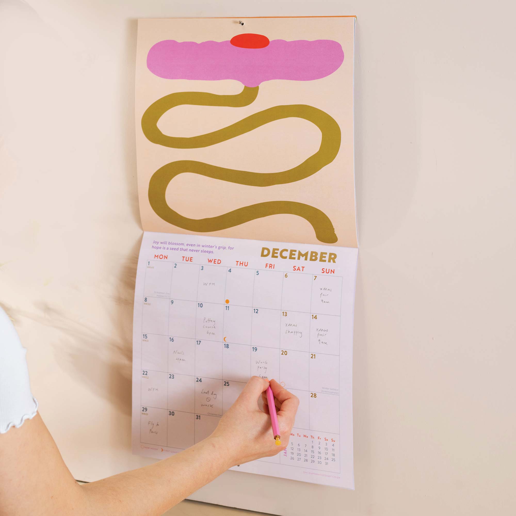 Each page mixes abstract shapes, playful colours and a nod to retro design. Paired with a seasonal quote, every month feels like a little dose of colour and optimism for your wall.