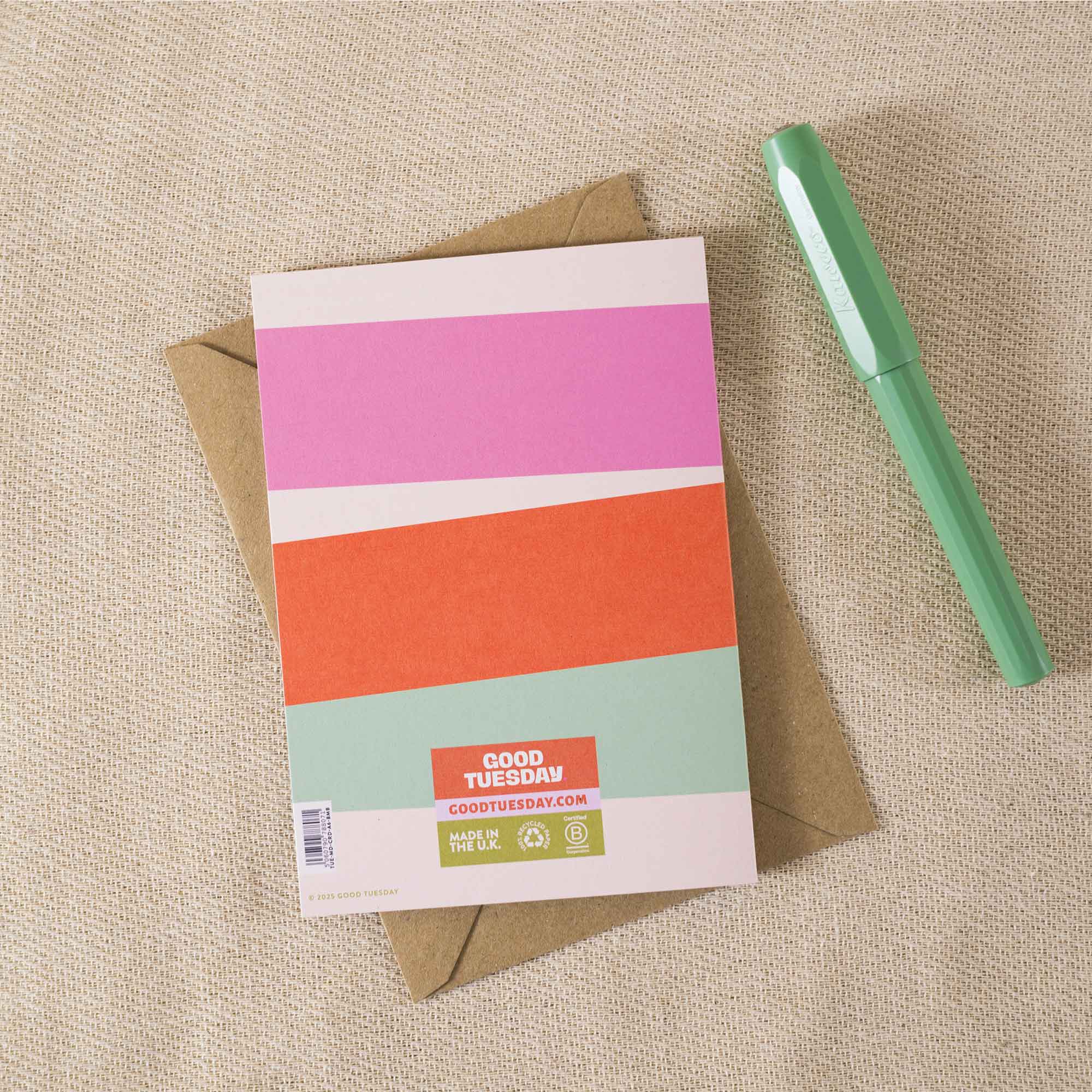 Designed and printed in the UK, on 100% recycled and recyclable thick paper that does not bleed. Paired with a recycled kraft envelope and plastic free packaging. The blank interior lets you write your own lovely message.