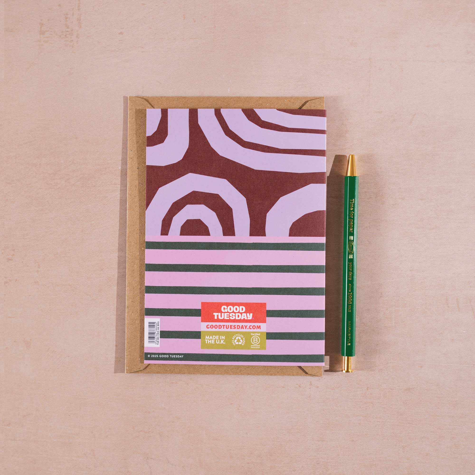 Designed and printed in the UK, on 100% recycled and recyclable thick paper that does not bleed. Paired with a recycled kraft envelope and plastic free packaging.