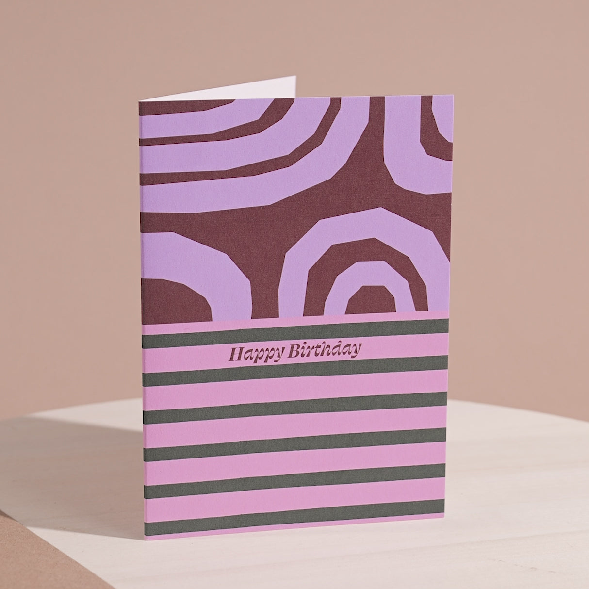 Bold abstract modern art shapes, trending colour palette, and playful stripes - shouts happy birthday in the freshest of ways.