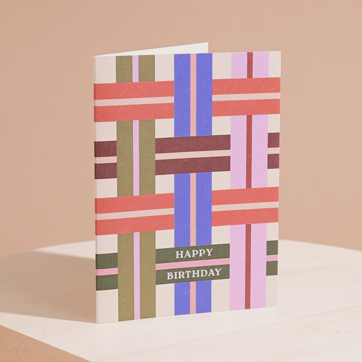 Bring a burst of colour to someone's birthday with this bold and playful design. Featuring interwoven stripes of earthy greens, vibrant blues, and warm oranges, this stylish card is all about energy and fun. It’s created for people who love modern patterns and creative design with a retro twist.