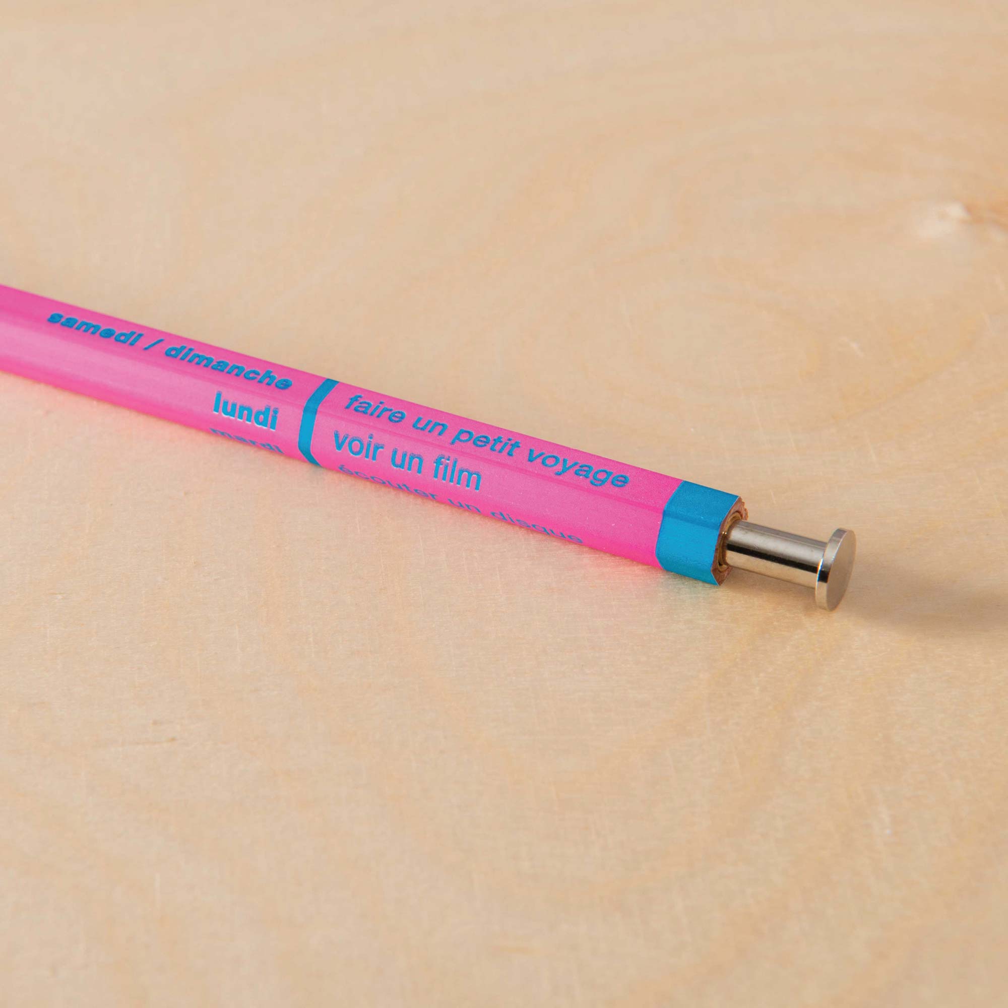 The day of the week is printed on the wooden shaft of the pen ‘En Français’ (that means in French in French.) in a contrasting colour - with a little activity to do on that day of the week. For example - Lundi - voir un film / Monday - watch a movie.