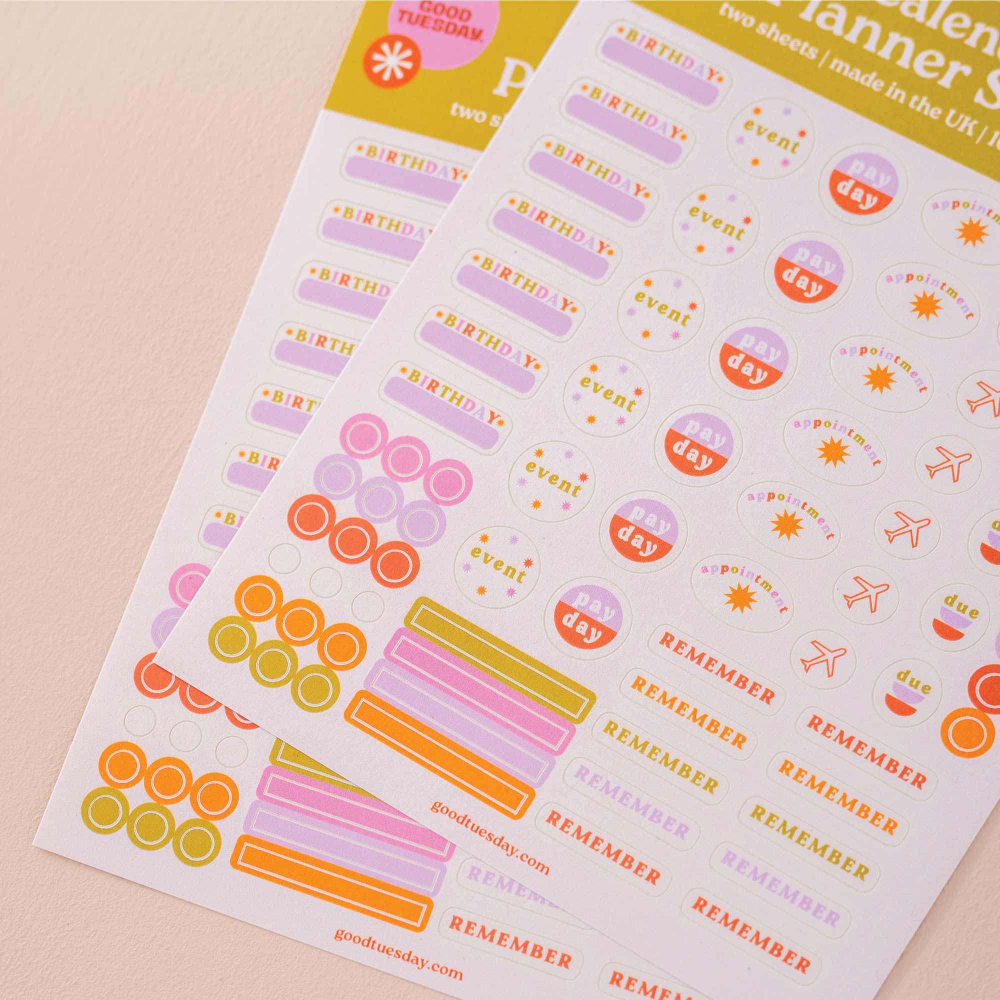 Two sheets of planner and calendar stickers. Use on your calendar, wall planner, or in your diary. 100% Recycled Paper. Made in the UK.
