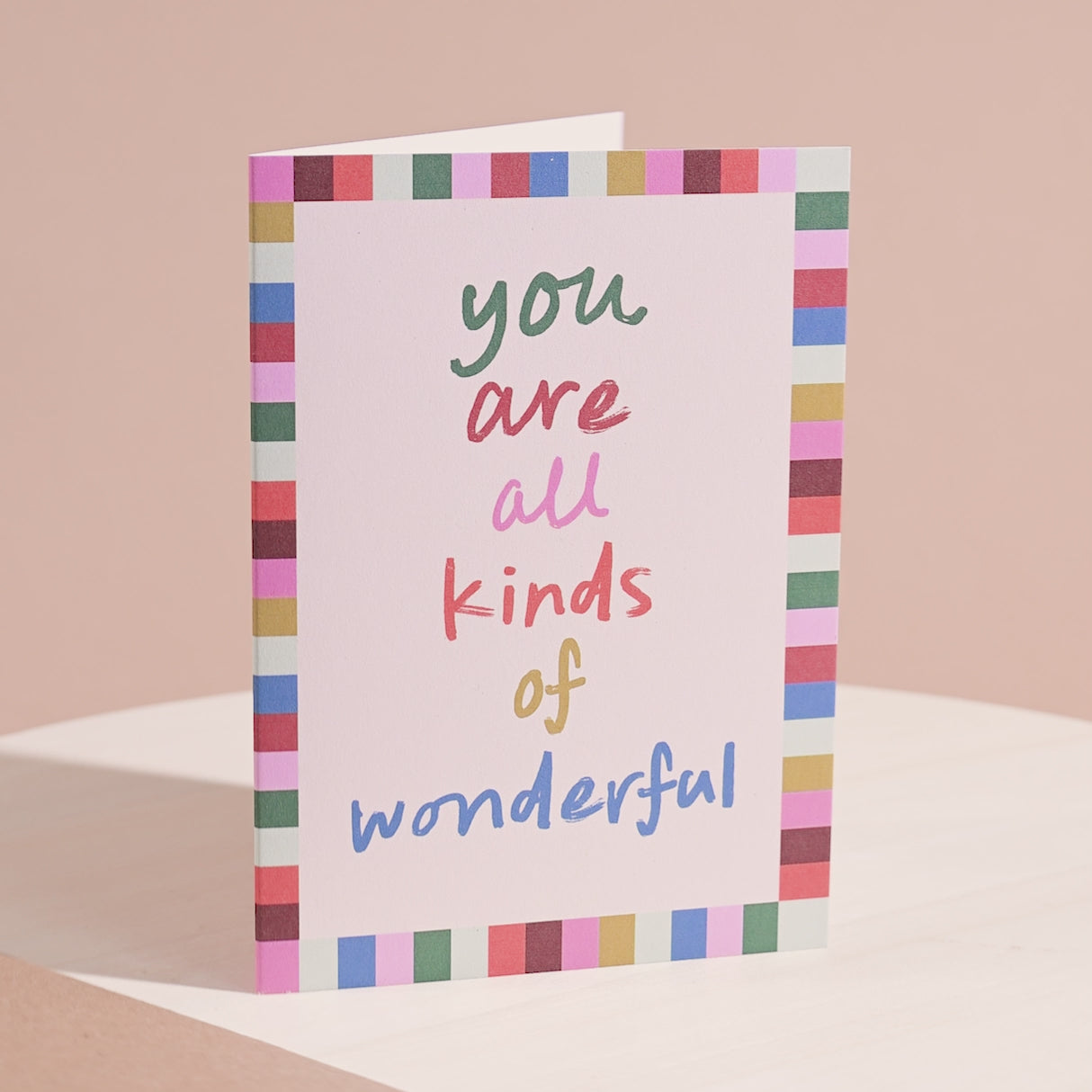 Spread joy with this colourful card that’s ready for any occasion. It’s got colourful, hand-lettered text that reads "You are all kinds of wonderful" framed by a colourful block border. Designed to make someone feel utterly special - a friend, family member or colleague who deserves to be put in the spotlight.