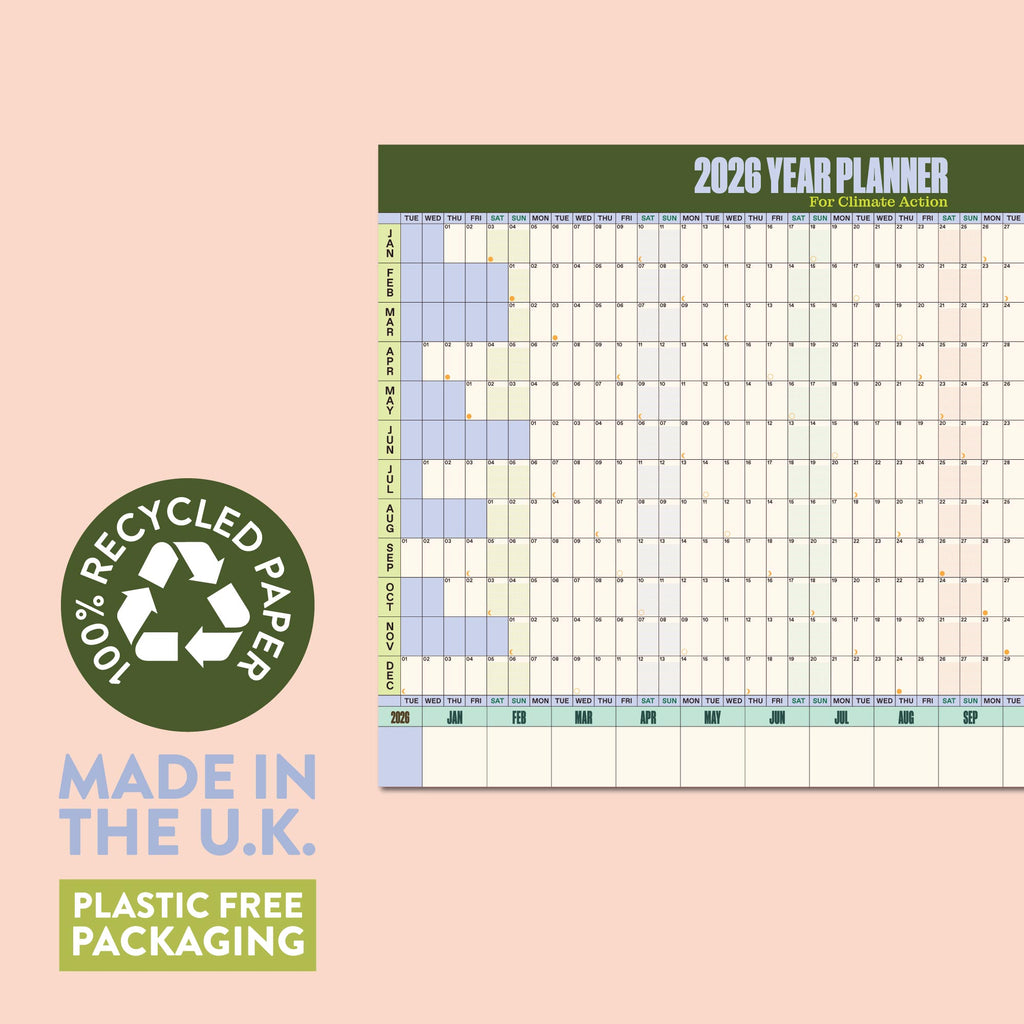 Printed on 100% recycled, recyclable paper in the UK, it gives you a clean overview of the year with the dates that really count. Month by month, from Earth Day to COP summits, the key climate action moments are right where you can see them.