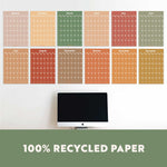 The 12 monthly large A3 prints can be arranged on the wall together for a full calendar year overview or choose to hang one or a few at a time. All printed on recycled paper in lovely muted earthy colours.