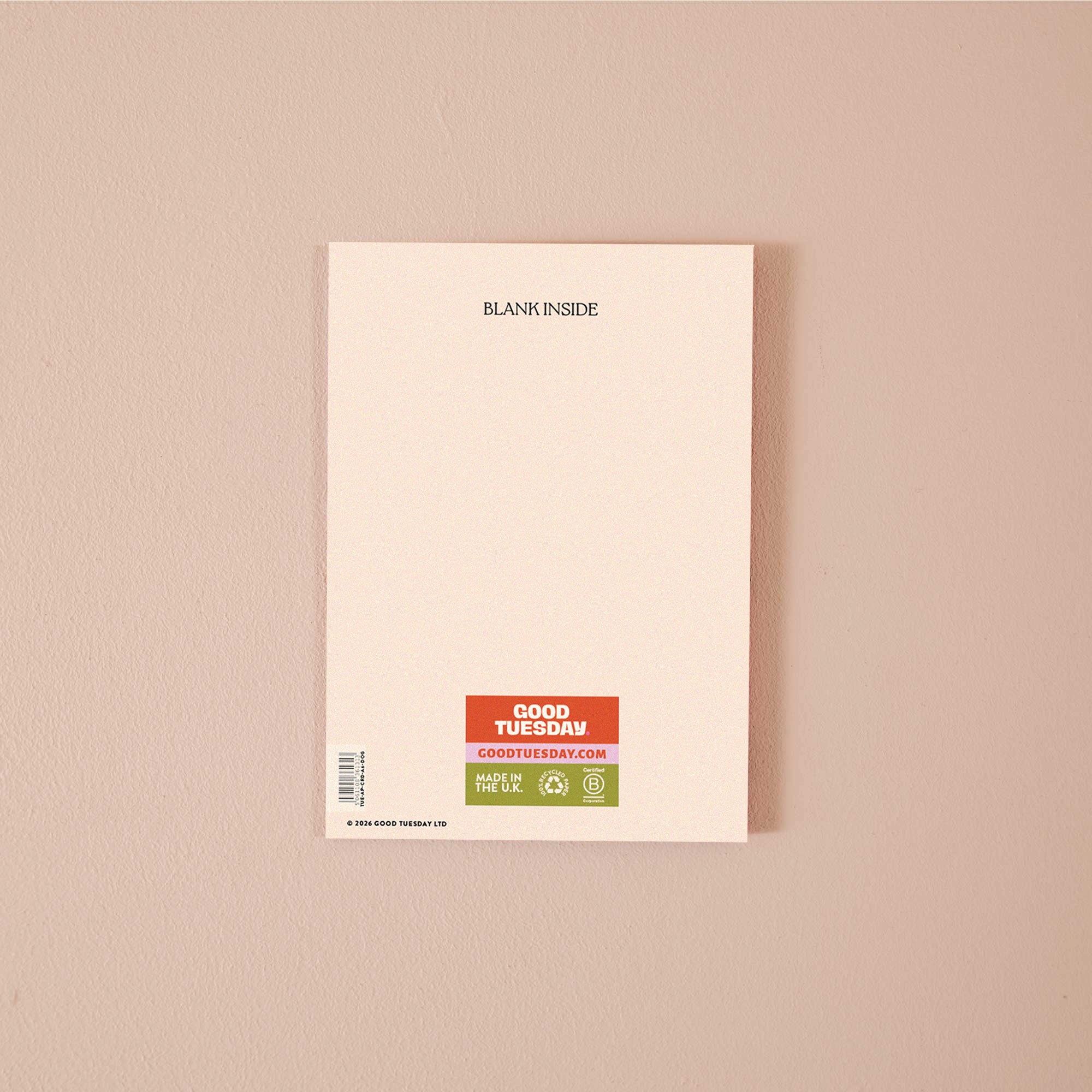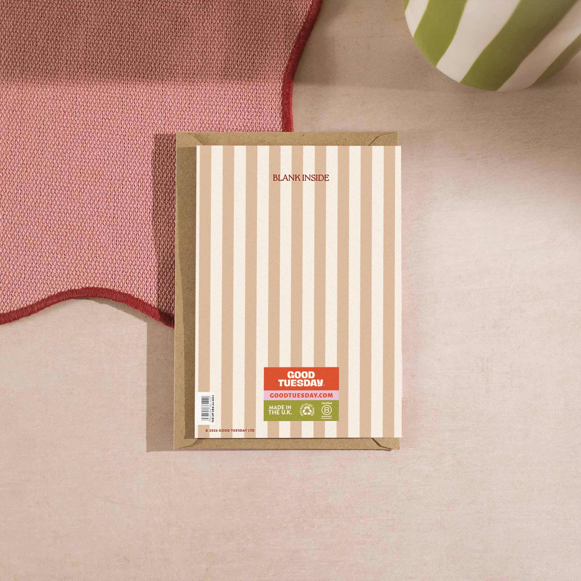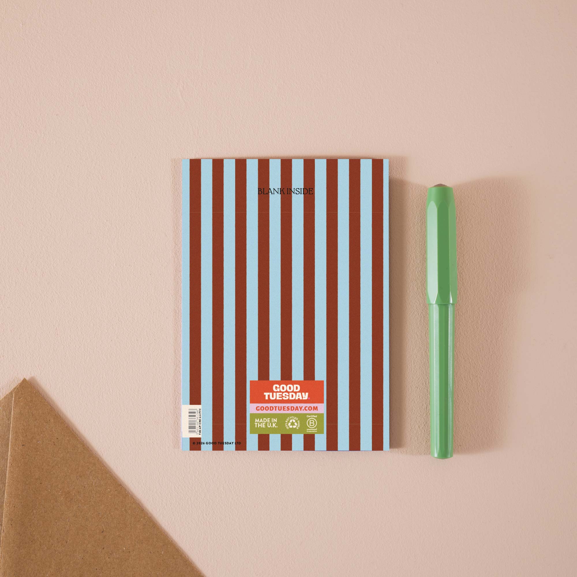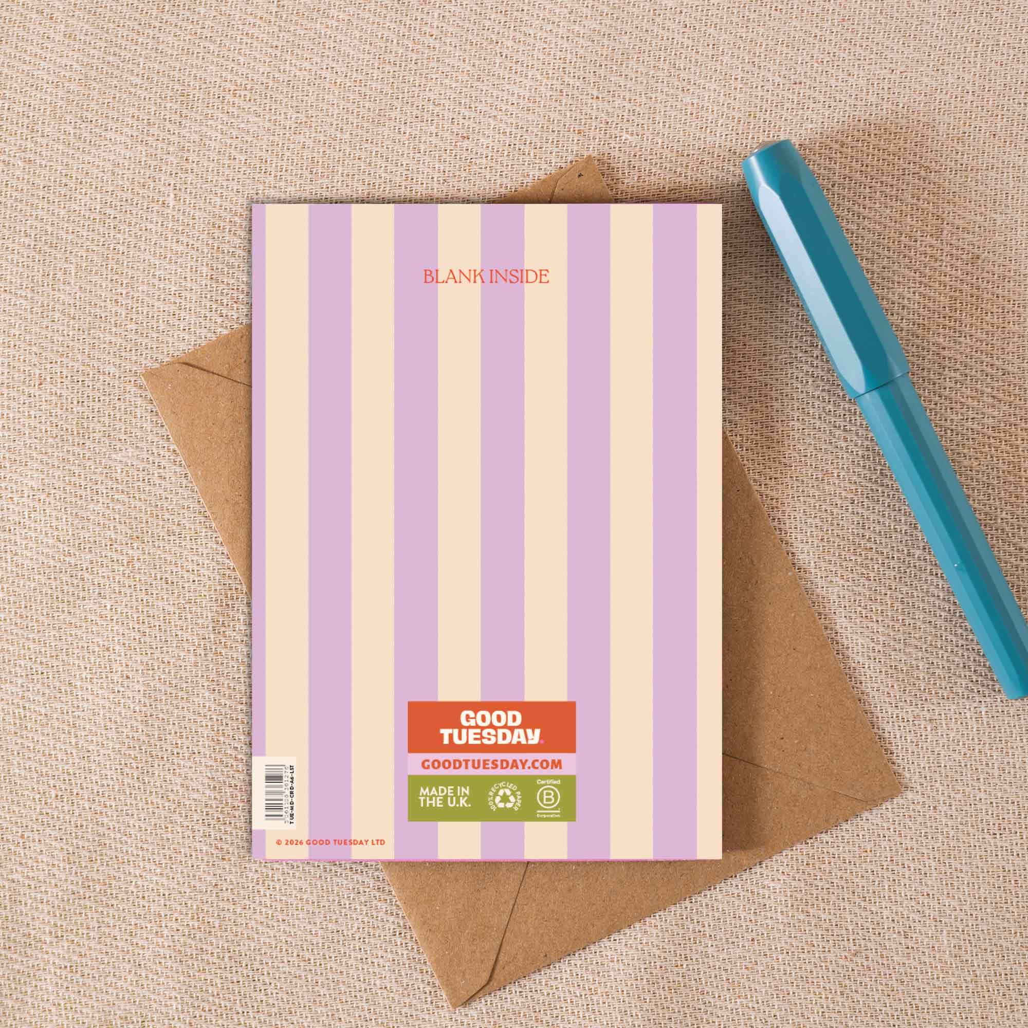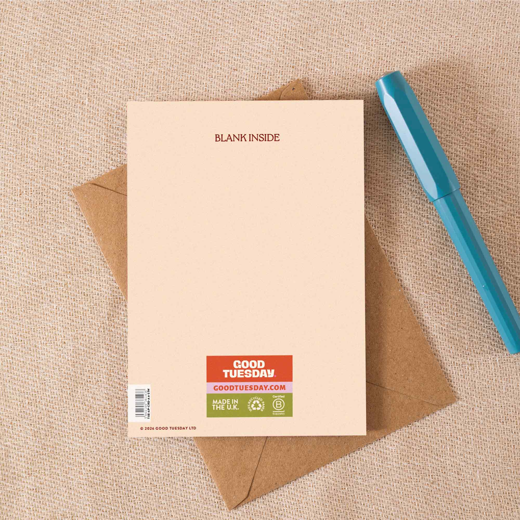 Each A6 card is printed in the UK on 100% recycled paper with a recycled kraft envelope. Blank inside, so you can say what you actually mean.