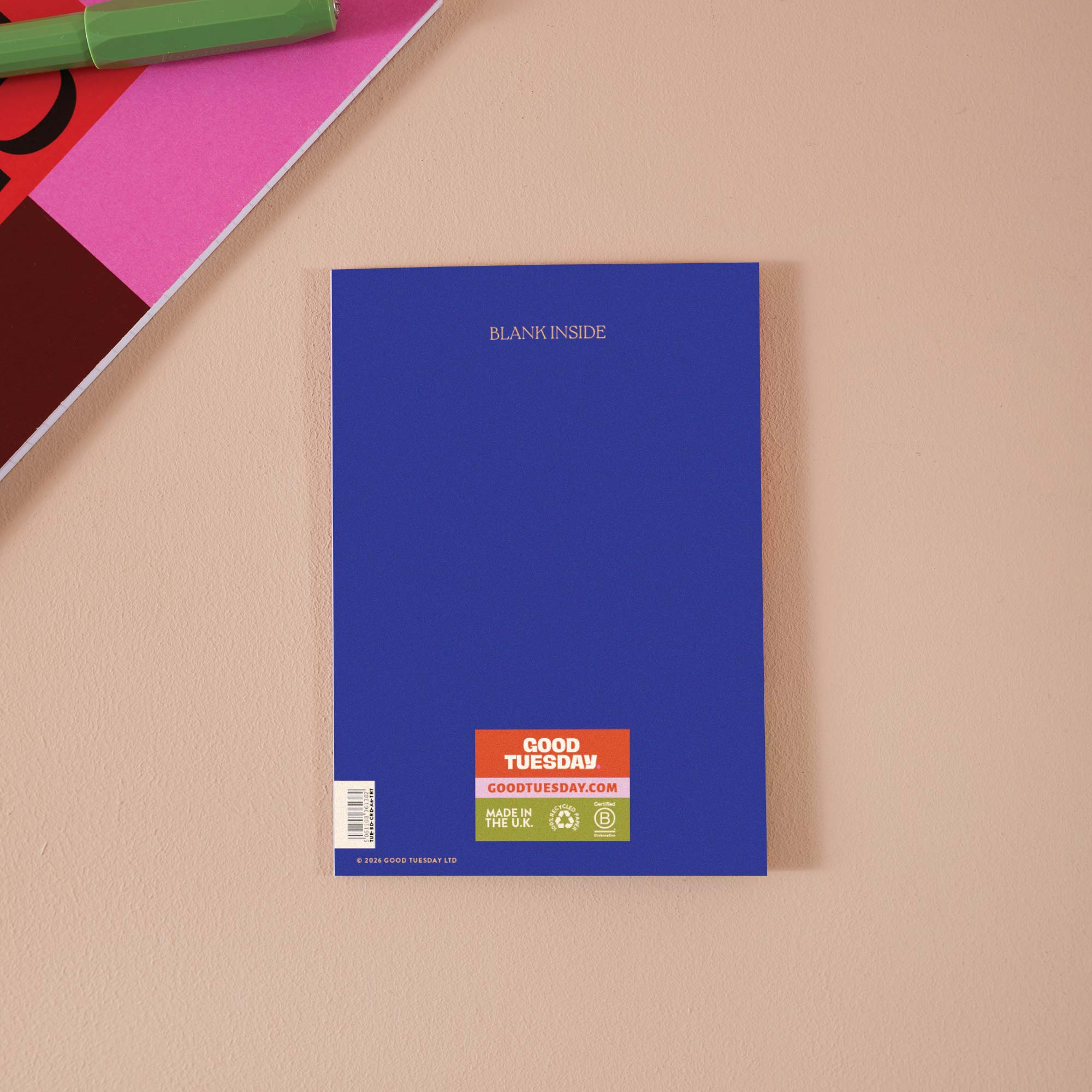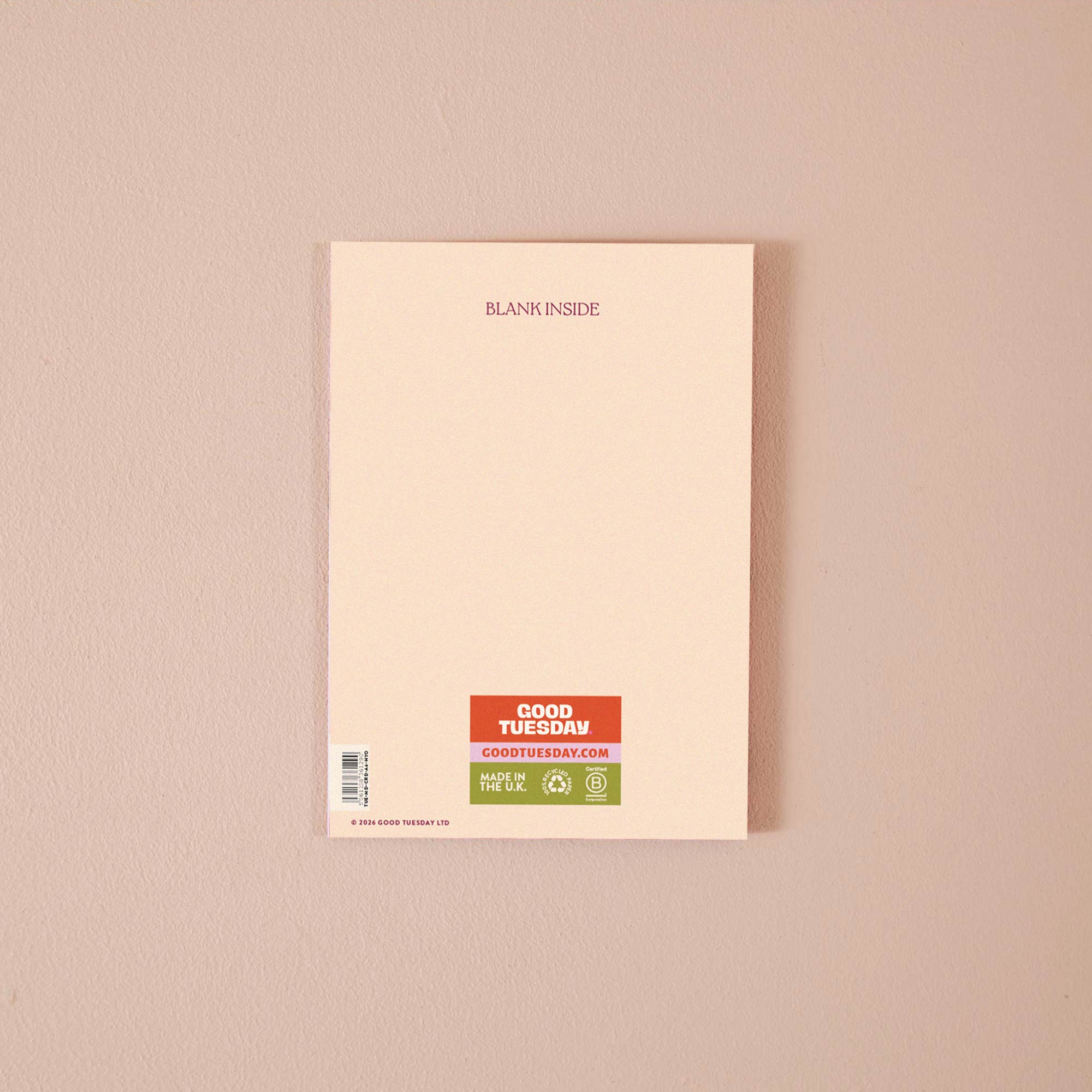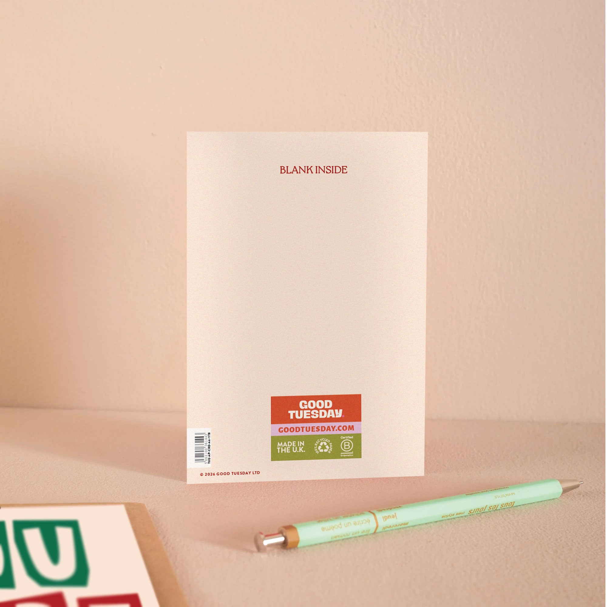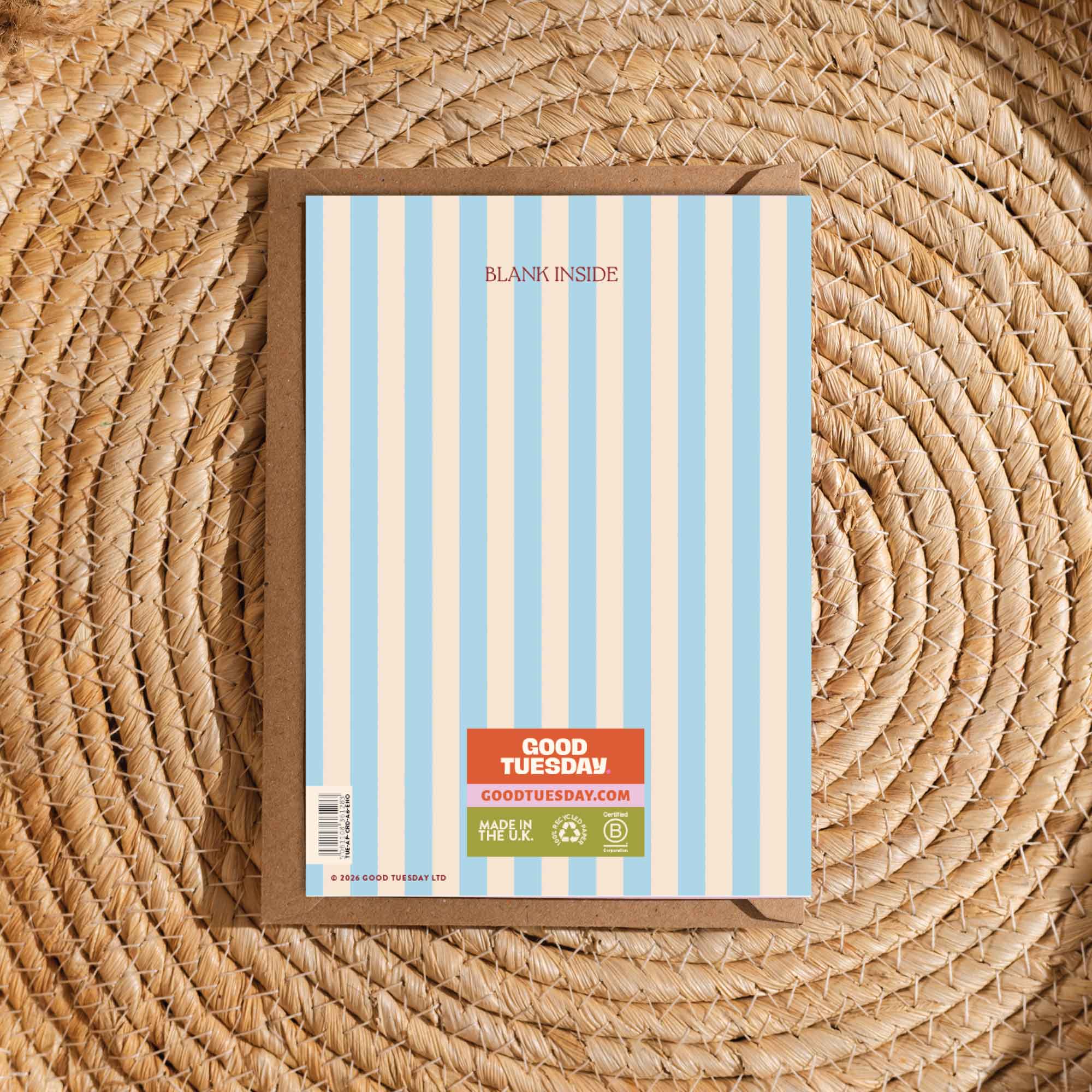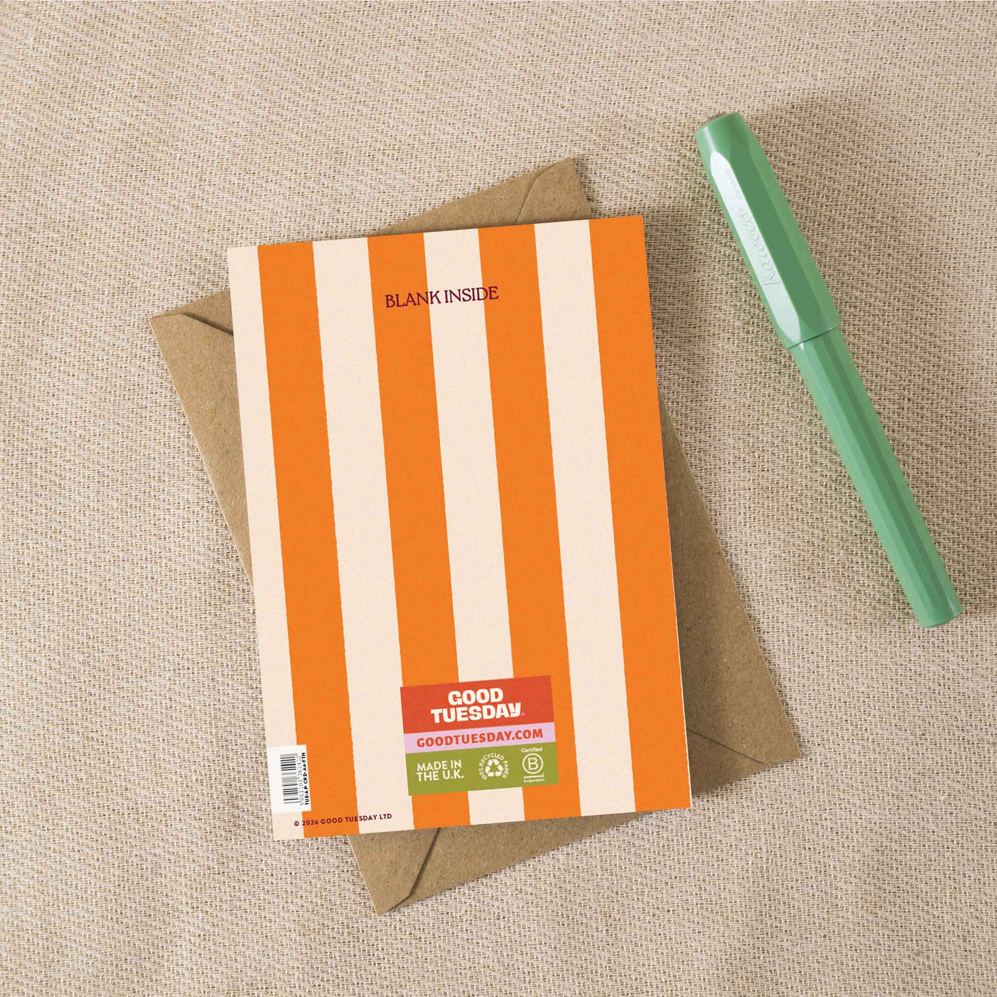Each A6 card is printed in the UK on 100% recycled paper with a recycled kraft envelope. Blank inside, so you can say what you actually mean.