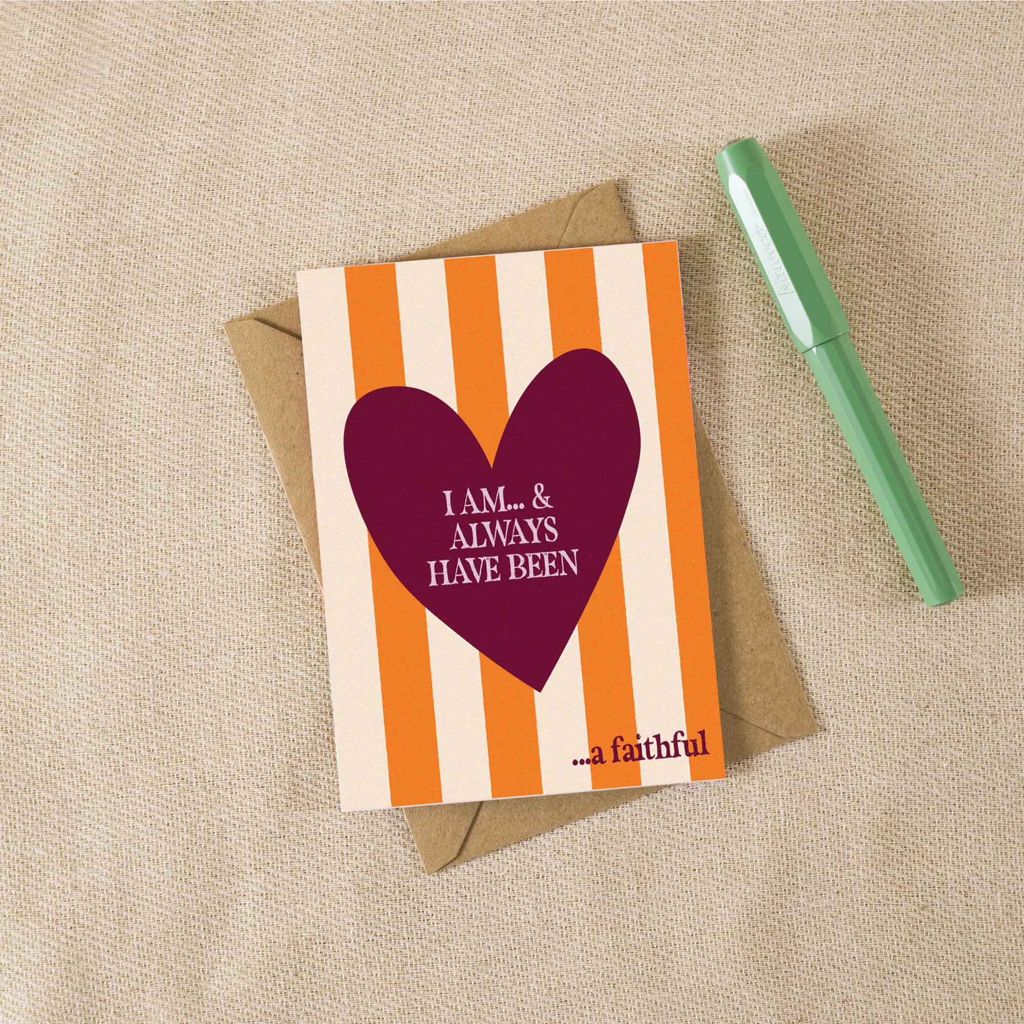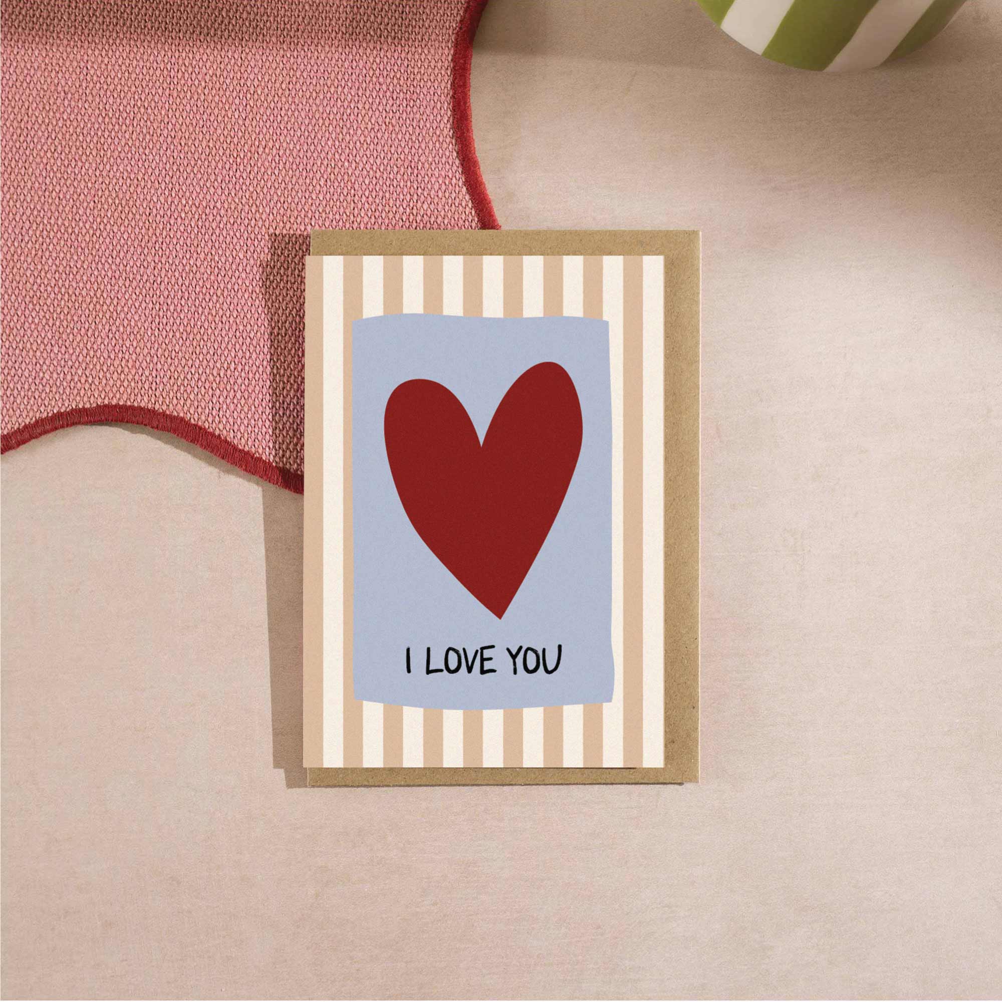 Greeting card with red heart and text on striped background