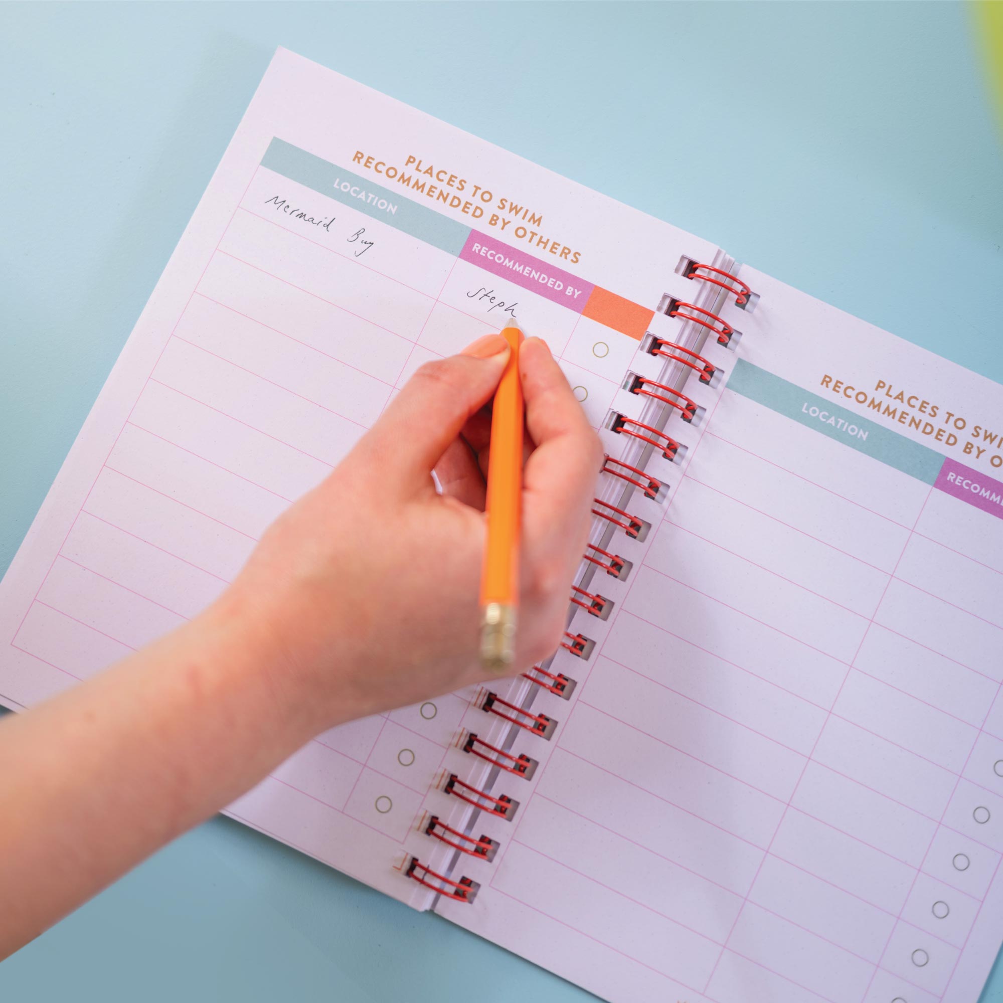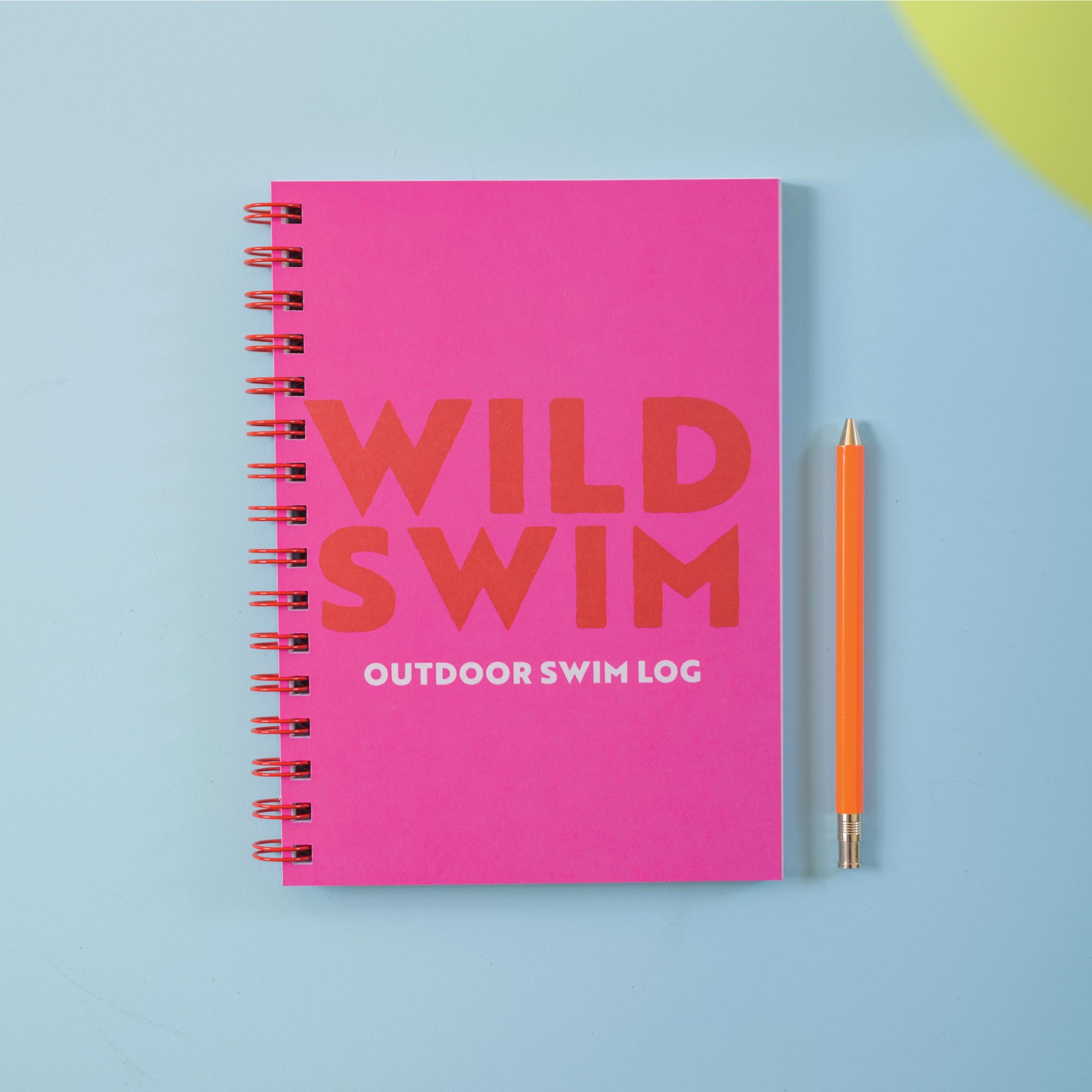 Keep track of all your wild swimming adventures with this spiral-bound swim journal log book - in shocking pink with bold red letters and colourful pages throughout.