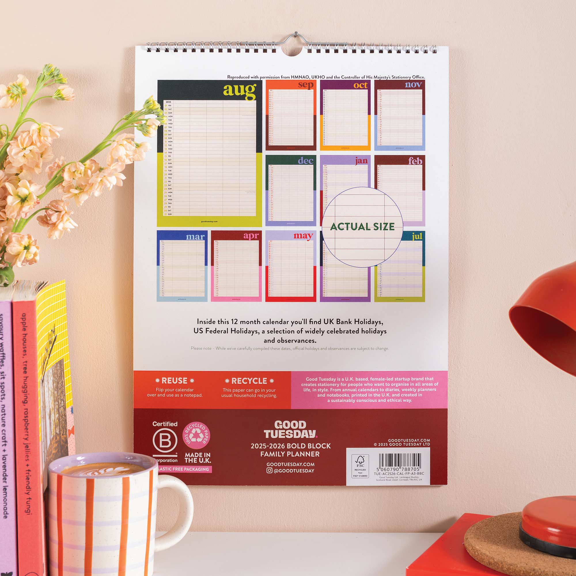 This large, bold, colour block family planner runs from August 2025 to July 2026, in line with the academic school-year, with a 5-column monthly layout to keep things clear and everyone accounted for.