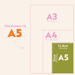 - A5: 14.8 x 21 cm // 5.8" x 8.3" inch